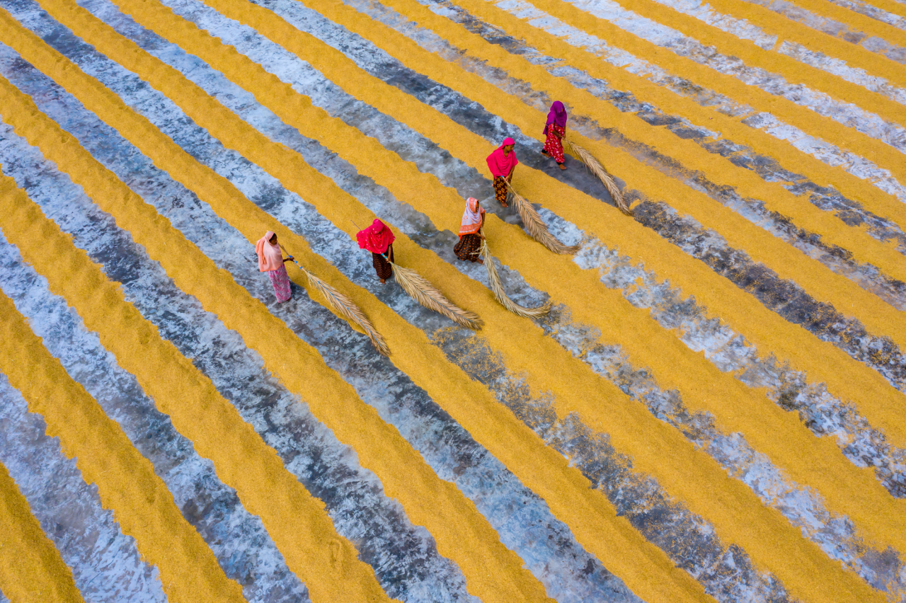 Cinq ouvrières utilisent une méthode traditionnelle pour sécher le riz au soleil, en l'étalant et en le retournant à l'aide de râteaux en bois avant de le répartir en rangées à l'aide de branches de palmier. Cette pratique quotidienne pouvant durer jusqu'à dix heures, reflète à la fois le rôle essentiel des femmes dans le maintien de la vie agricole et la continuité des traditions agricoles le long des Routes de la Soie.