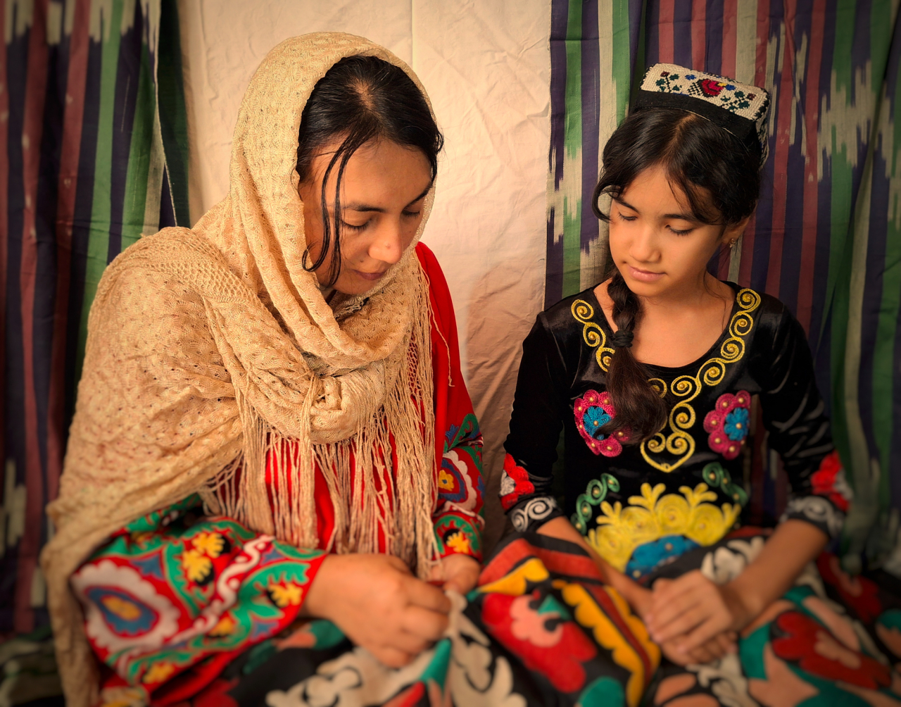 Une mère enseigne à sa fille l'art de la broderie "suzani”, une tradition héritée des Routes de la Soie, où chaque point de couture porte en lui l'histoire et l'attention de générations entières.