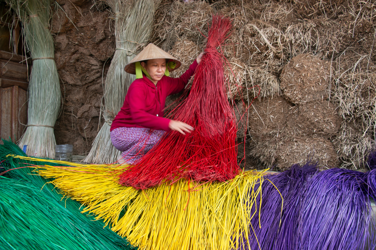 Le village d'An Cư, situé au centre du Viet Nam, pratique depuis des siècles l'artisanat du tissage de nattes en jonc et en carex. Sur cette photo, une artisane aère des brins de jonc après les avoir teints dans des couleurs vives : vert, violet, jaune et rouge. Ces objets artisanaux complexes, autrefois commercialisés le long des routes de la soie, soulignent l'importance du patrimoine culturel vietnamien et le rôle essentiel des femmes dans la préservation de ces traditions à travers les générations.