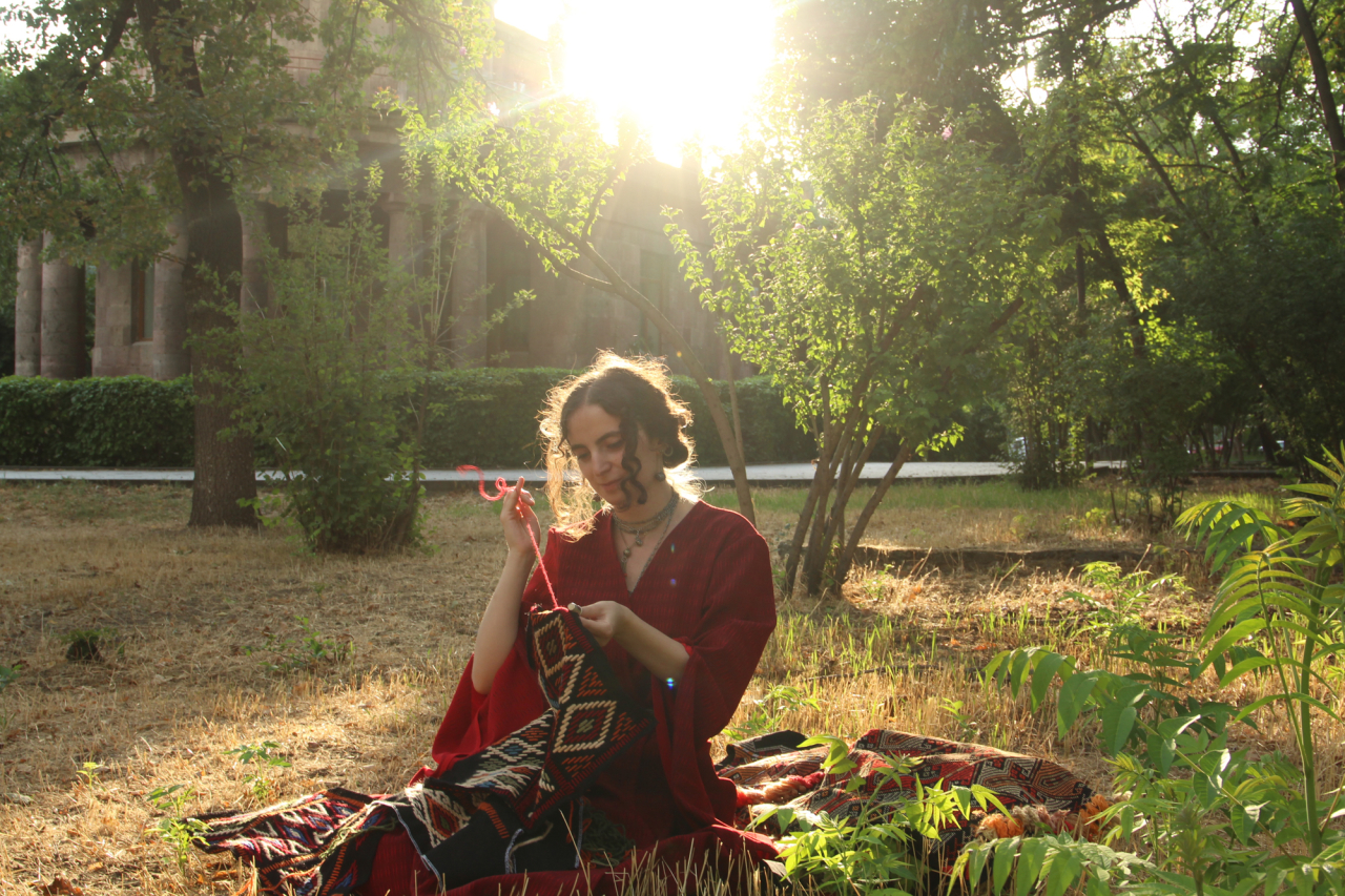 Une jeune femme est assise sur l'herbe dans un parc tranquille d'Erevan, en Arménie, et travaille à sa broderie. Elle porte un « taraz », une robe traditionnelle arménienne, et perpétue à travers ses mains l'héritage vivant de l'artisanat qui se transmet depuis des générations le long des Routes de la Soie.